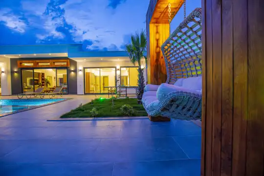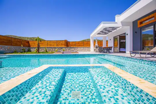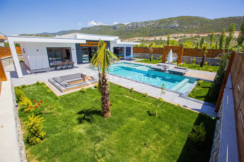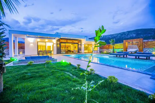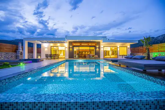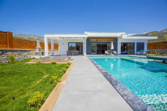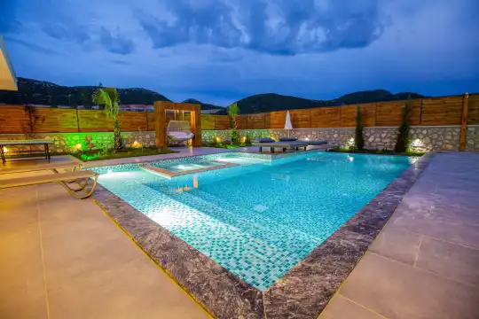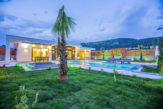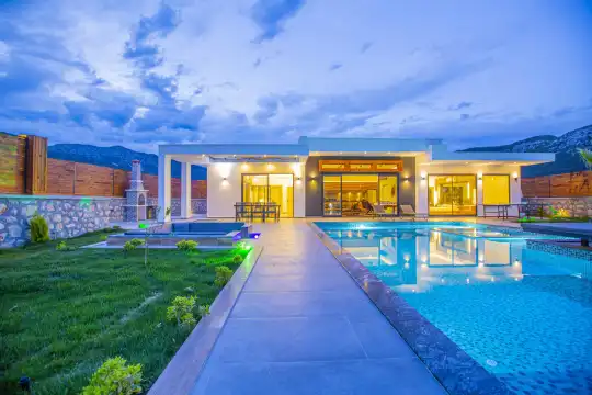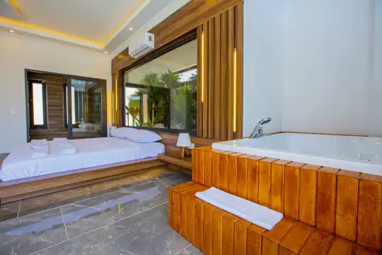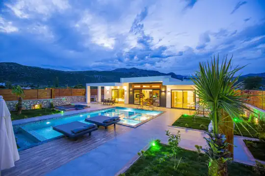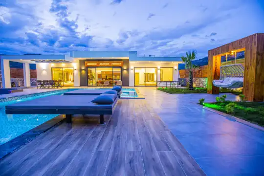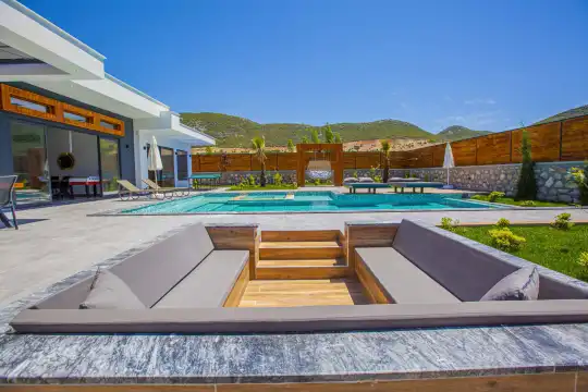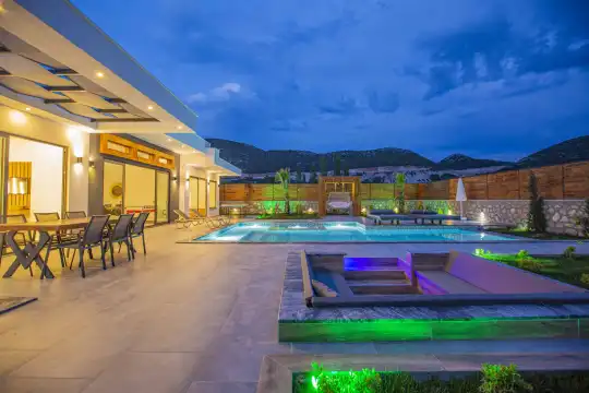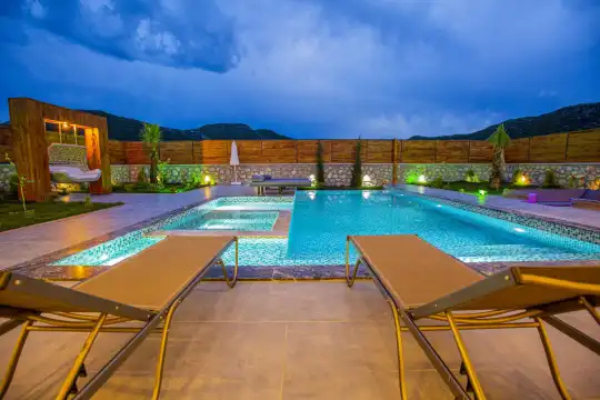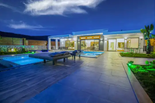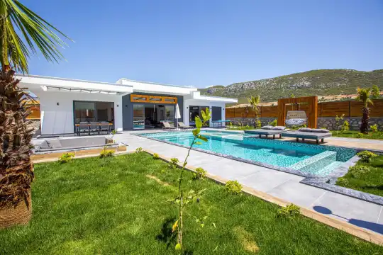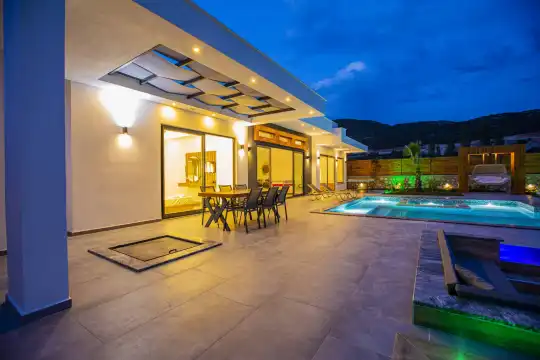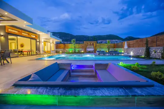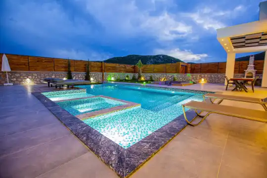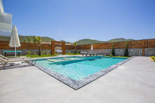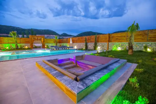 Villa Bahamas, our sheltered villa located in the Kalkan Bezirgan region, has 2 bedrooms and an accommodation capacity of 5 people. Our villa is ideal for conservative families and honeymoon couples because it is sheltered. Villa Bahamas has a large, sheltered garden with a pool, children's pool, sun loungers, swings, table tennis, garden set, dining table and barbecue. There is a jacuzzi in one of the bedrooms in the modernly designed villa. You can rent Villa Bahamas, which is highly preferred with its large garden and modern architecture, at Kalkanvilla.org with early booking opportunities.