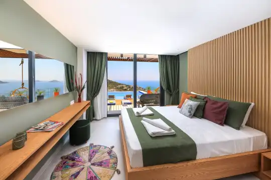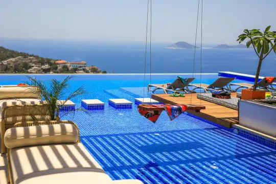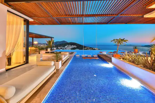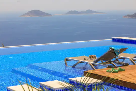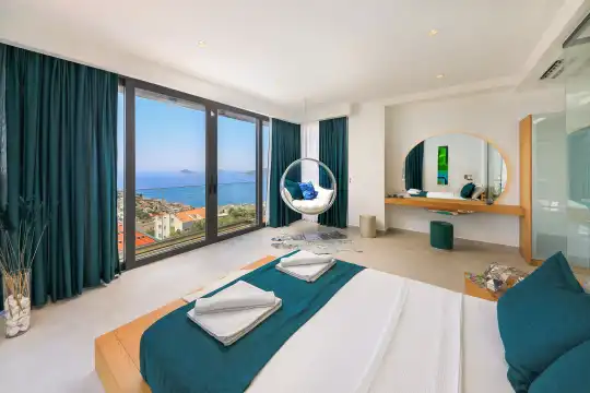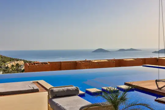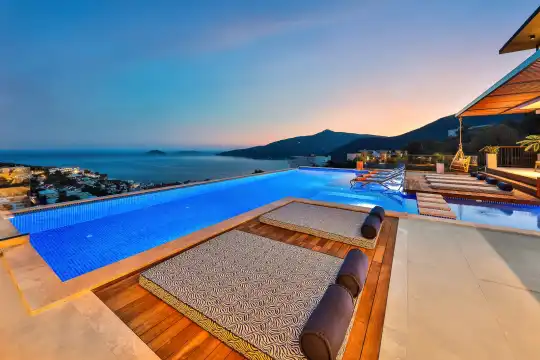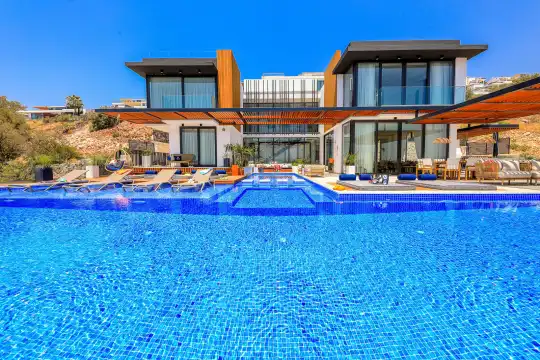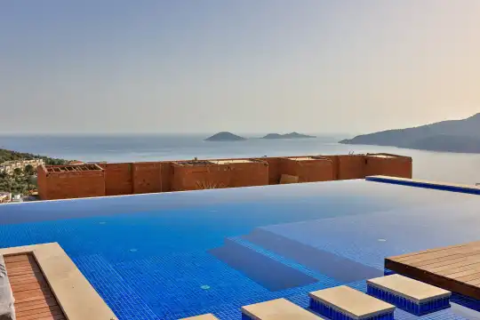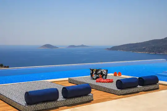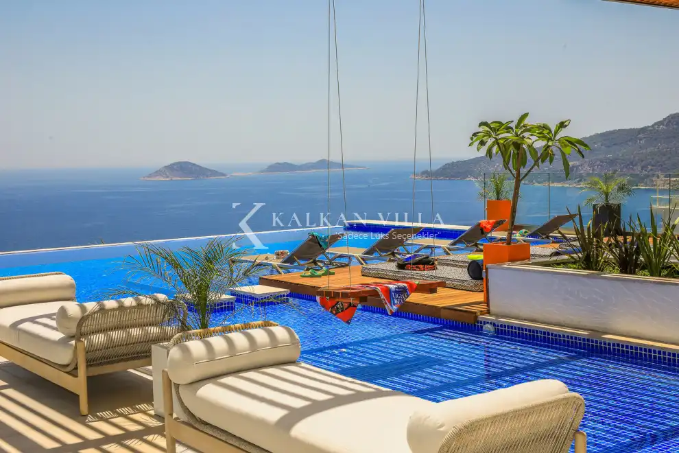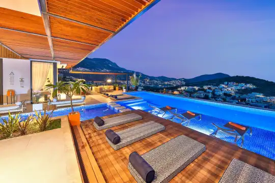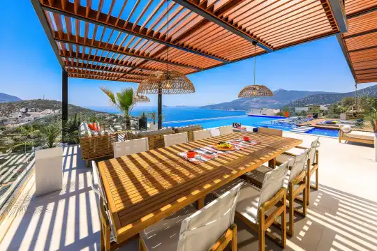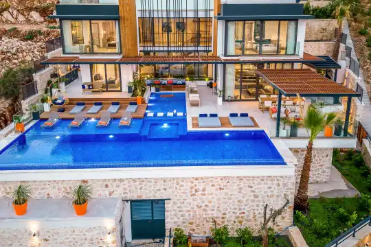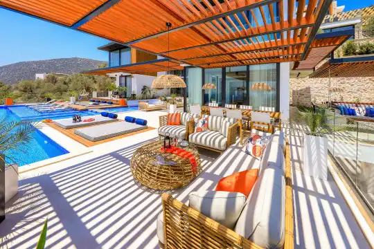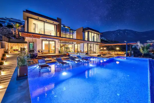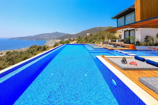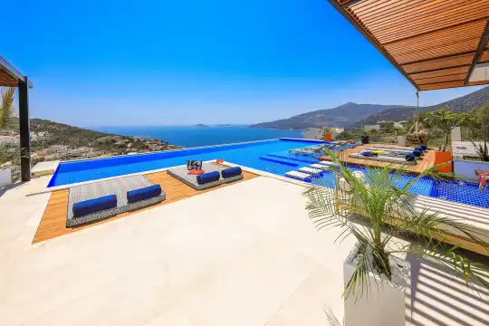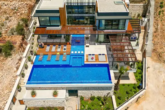 Villa Pax, located in Kalkan Kalamar Region, our villa with magnificent sea view has 7 bedrooms and an accommodation capacity of 14 people. Located in a quiet location away from the noise of the city, Villa Pax is ideal for crowded families and groups of friends. In the garden of our villa with sea view, there is a pool, sun loungers, a sitting corner, a barbecue and a dining table where you can have a pleasant dinner with your loved ones accompanied by sea views. All details have been considered for you, our guests, in our newly decorated villa with a modern design. You can choose Villa Pax for a pleasant and unforgettable holiday. In addition to this magnificent villa, there is a sauna, fitness room, movie theater, game room for children and billiards.