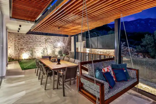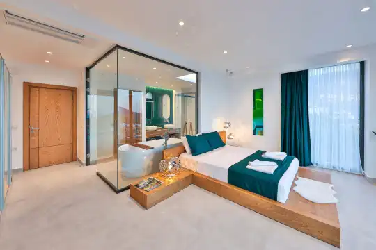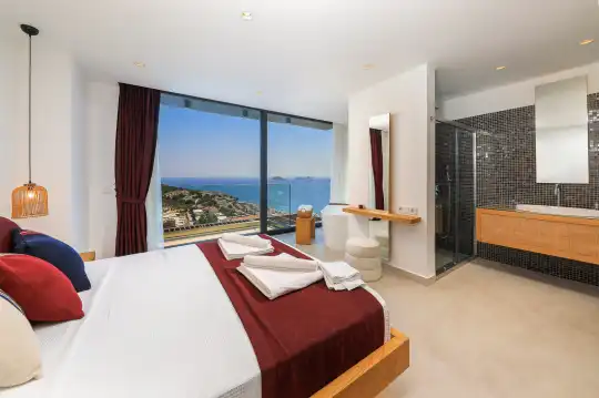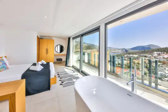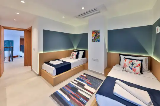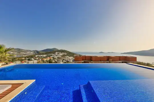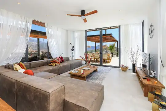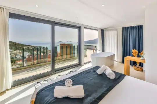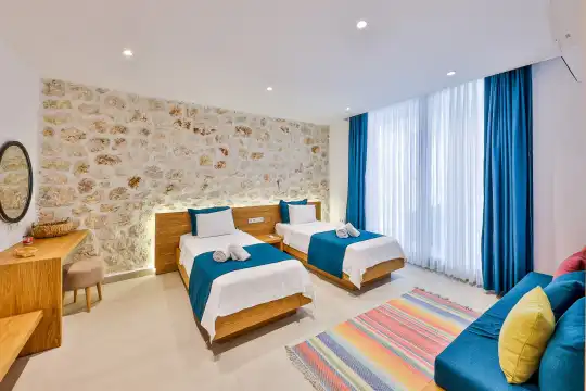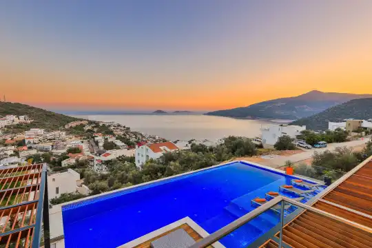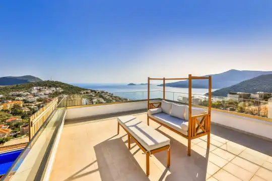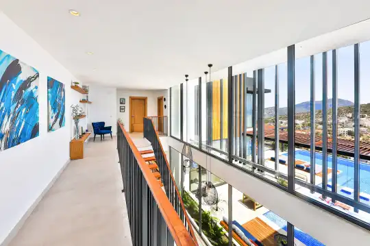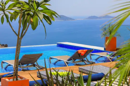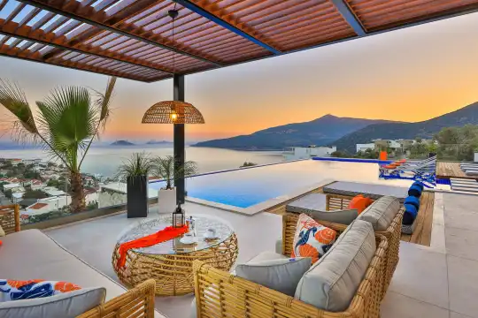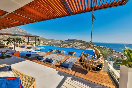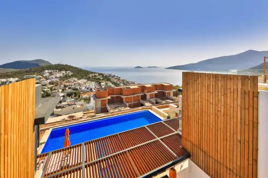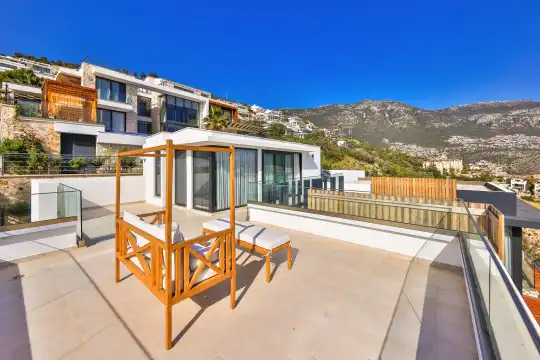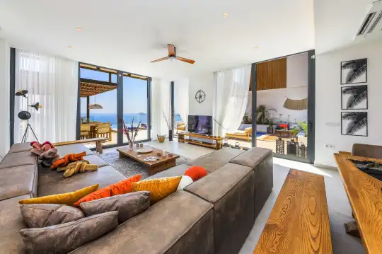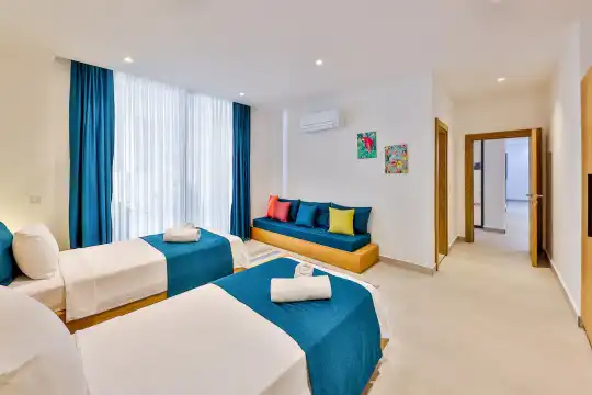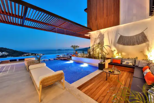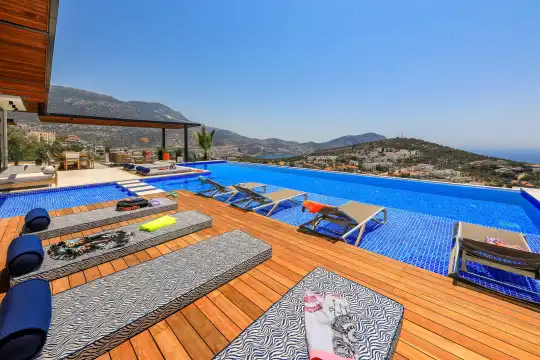 Villa Pax, located in Kalkan Kalamar Region, our villa with magnificent sea view has 7 bedrooms and an accommodation capacity of 14 people. Located in a quiet location away from the noise of the city, Villa Pax is ideal for crowded families and groups of friends. In the garden of our villa with sea view, there is a pool, sun loungers, a sitting corner, a barbecue and a dining table where you can have a pleasant dinner with your loved ones accompanied by sea views. All details have been considered for you, our guests, in our newly decorated villa with a modern design. You can choose Villa Pax for a pleasant and unforgettable holiday. In addition to this magnificent villa, there is a sauna, fitness room, movie theater, game room for children and billiards.