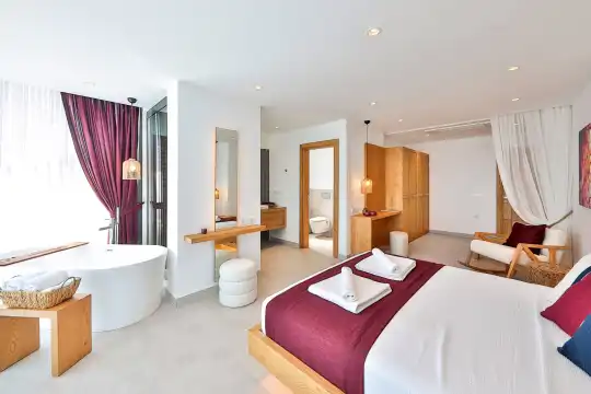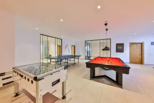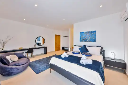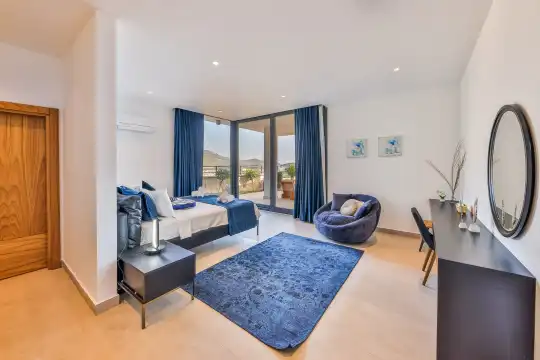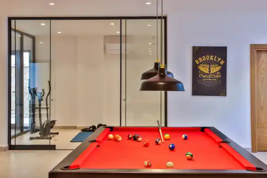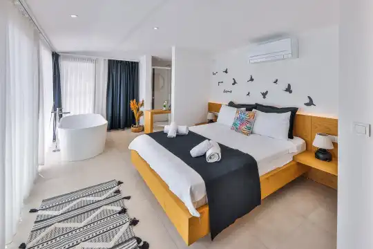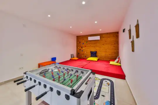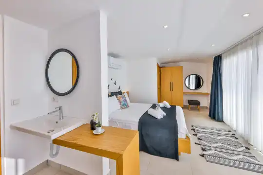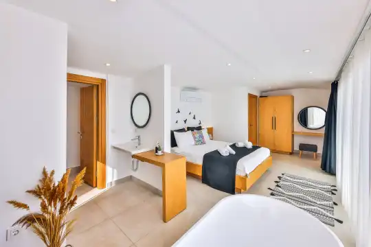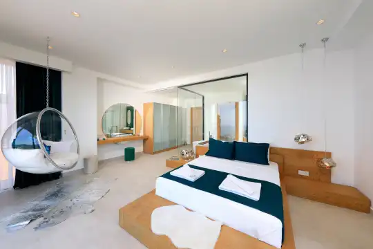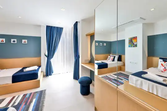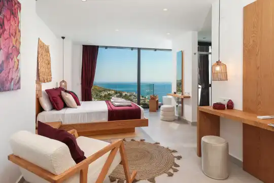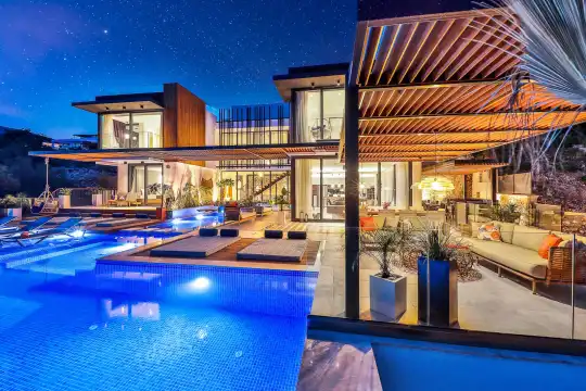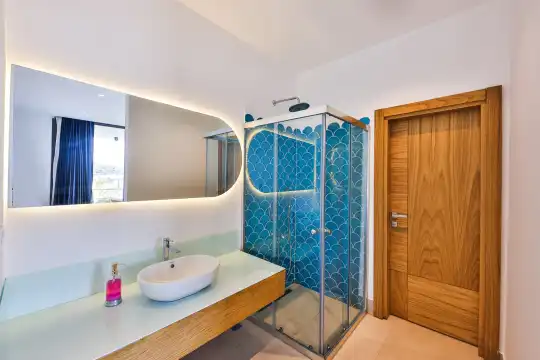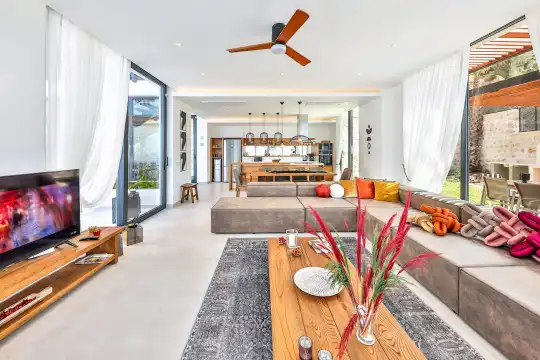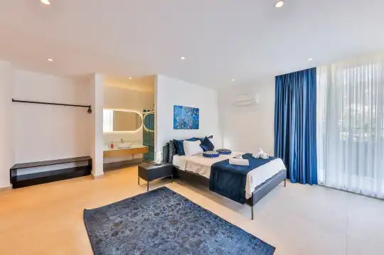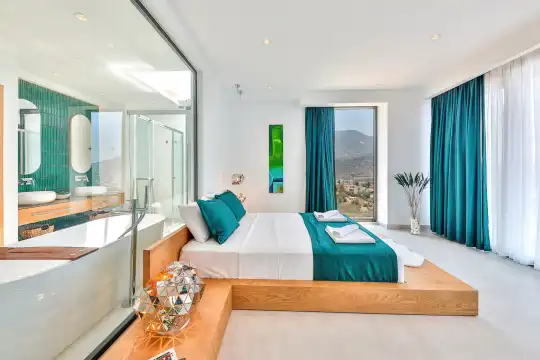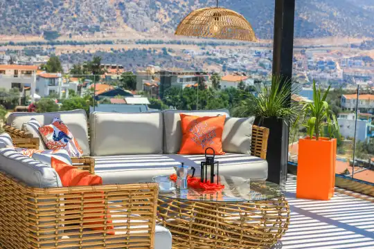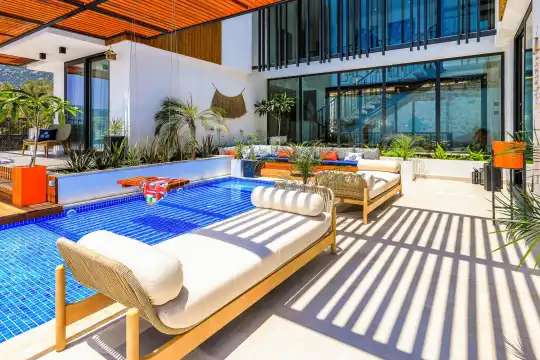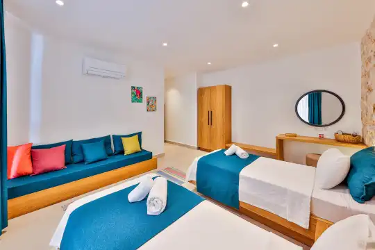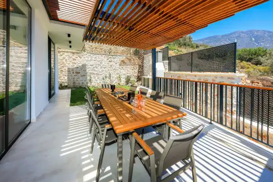 Villa Pax, located in Kalkan Kalamar Region, our villa with magnificent sea view has 7 bedrooms and an accommodation capacity of 14 people. Located in a quiet location away from the noise of the city, Villa Pax is ideal for crowded families and groups of friends. In the garden of our villa with sea view, there is a pool, sun loungers, a sitting corner, a barbecue and a dining table where you can have a pleasant dinner with your loved ones accompanied by sea views. All details have been considered for you, our guests, in our newly decorated villa with a modern design. You can choose Villa Pax for a pleasant and unforgettable holiday. In addition to this magnificent villa, there is a sauna, fitness room, movie theater, game room for children and billiards.